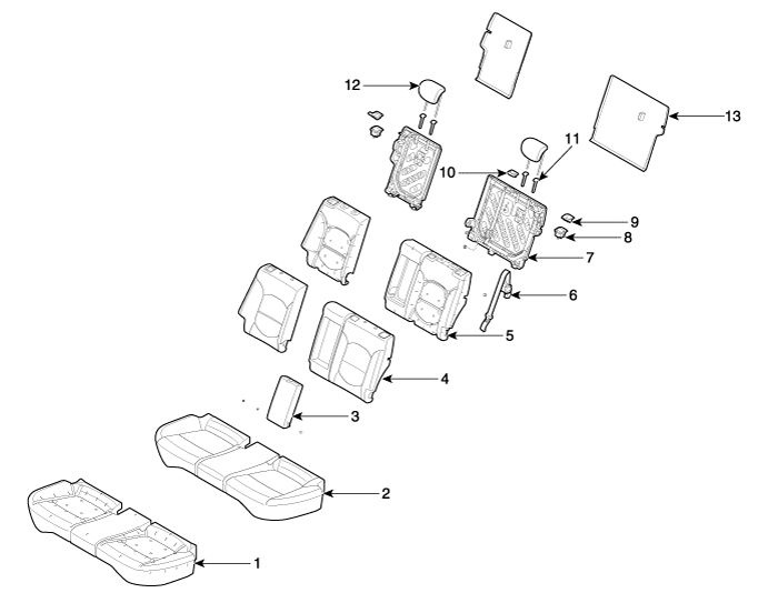 8. Folding lever assembly 9. Folding lever bezel 10. Webbing guide 11. Rear seat headrest guide 12. Rear seat headrest 13. Rear seat carpet back panel |