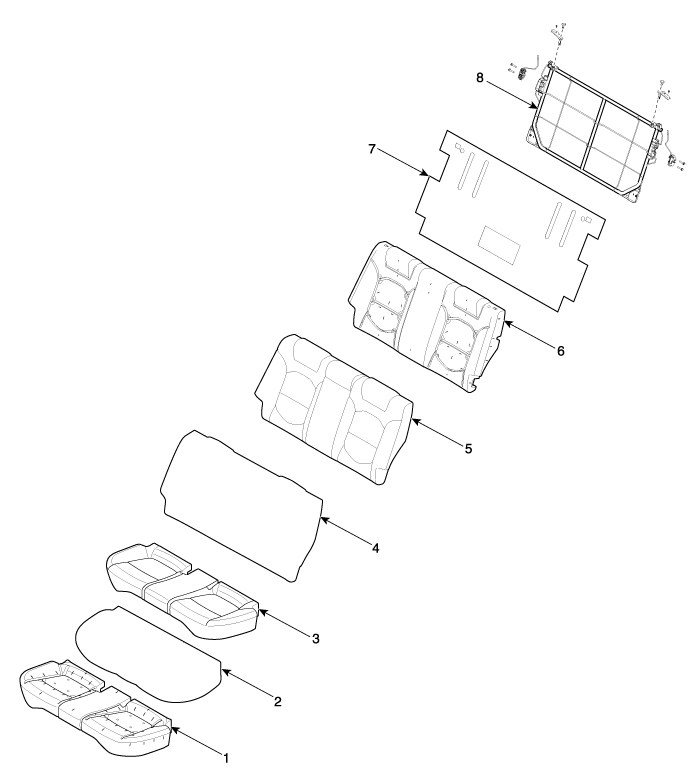 5. Rear seat back cover 6. Rear seat back pad 7. Rear back antinoise cover 8. Rear seat back frame |
