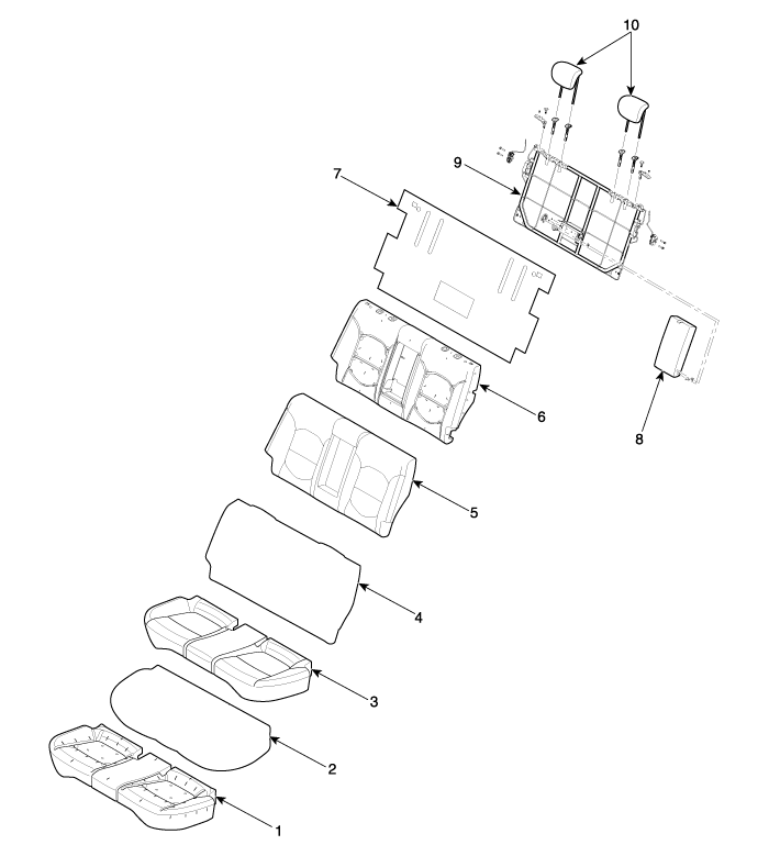 6. Rear seat back pad 7. Rear back antinoise cover 8. Rear seat back armrest 9. Rear seat back frame 10. Rear seat headrest |