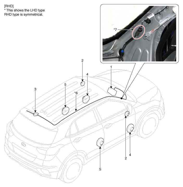 | 1. Audio unit 2. Tweeter speaker 3. Roof antenna (Radio) 4. Front door speaker |