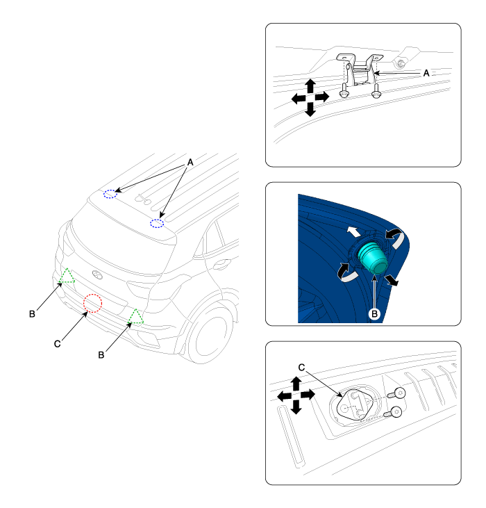 After loosening the tail gate striker (C) mounting bolts, adjust the